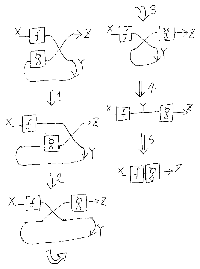 TrYX,Z((f×g);σY,Z)からはじめて、 f;gへと変形する。図式の 変形を下に描いておいた。説明は下にある。