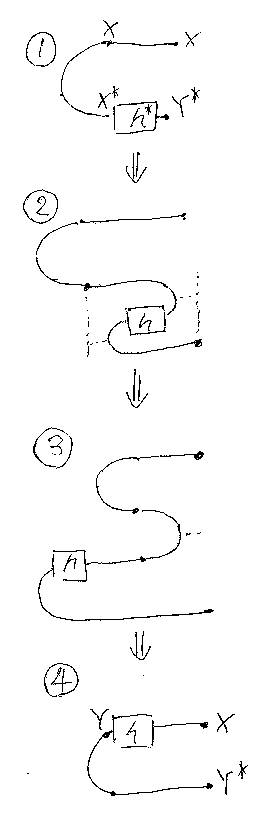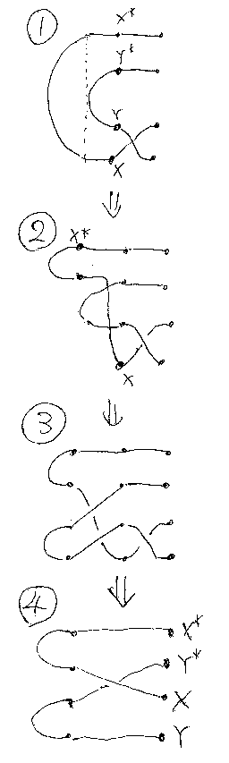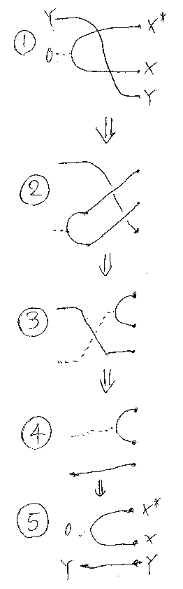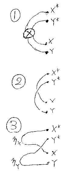 以下にこの公式の背景を説明しよう。X* + Y* から X + Y へと、カーブ したワイヤーで繋ごうと思うと、ストレートワイヤーでは無理で、曲がりと共 にねじりを入れる必要がある。つまり、ターニング・ジャンクションはリバー ス・ケーブルなのである(下図の1番)。リバース(クロス)・ケーブルをばらすと、交差 した2本のケーブルになる(下図の2番)。交差とつながりの具合を記述すると、 まとめ公式の左辺になる(下図の3番)。(等式ではA, B、図ではX, Yとなっ ているのは手違い。直さないけどカンベンしてね。)