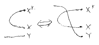 この半バニッシング公式を示すための補題として、 (ηX + Y) = (Y + ηX)(σY,X* + X)(X* + σY,X) を示す(下図)。 これは、ターニング・ジャンクションとストレート・ジャンクションの並列が あったとき、ターニングと2回交差する形で順序交換をしていいこと、その逆 に2回の交差を解消していいことを主張している。仮にクロスオーバー公式と 呼んでおこう。