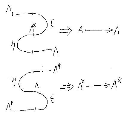 双対化公式 (A + ηB);(A + f* + B);(εA + B) = fにおけるfを、A = ιA:A→Aと置くと、 (A + ηA);(A + A* + A);(εA + A) = A となる。 (A + A* + A)は省略していいので、(A + ηA);(εA + A) = A だが、こ れはZ字の引き伸ばし公式に他ならない。S字の引き伸ばしも同様に得られる。