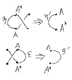 「お絵描き圏論」でも述べたように、ηA、η'A、εA、ε'A は、半 円形のカーブ、または180度の回転を与えるものである。一方、双対オペレー タも射を逆さまにする操作なので、ηと無関係であるはずがない。 コンパク ト閉圏を定義する等式群は、これら、入れ替え、鏡映、ねじれ、回転などの 「逆さまにする/ひっくり返す」操作の相互関係を規定したものである。「逆さま/ひっくり返し」の導入に より、通常の圏では不可能だったルーピングが導入され、再帰や繰り返しの記 述にも使えるようになった。