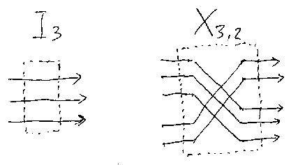 さて、‘ジャンクション’(junction; 接合器)の説明をしよう。ジャンク ションとは特殊なボックスである。記号In で表される自明なジャンクショ ン(あるいはストレートなジャンクション)と記号Xn, mで表されるクロ ス・ジャンクションを導入する。とりあえず下の図は、 I3とX3,2である。