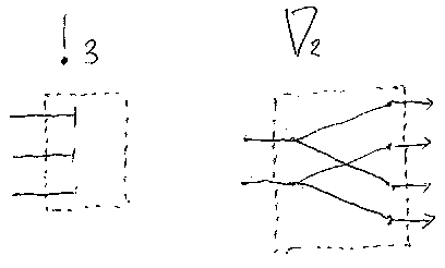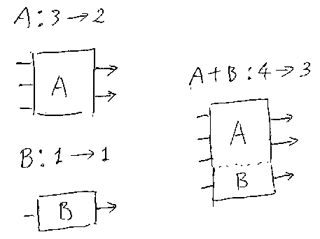 あっ、言いわすれた。いくらエンカガンでも次のことは守ってほしい -- A;B を考えるときは、Aの出力ポート数とBの入力ポート数が同じ時に限る!出力ポー トの一部と入力ポートの一部をつなぐこともできるが、最初からそんなこと考 えるとややこしいだけだから、“完全でストレートな接続”に限定する (*注4)。