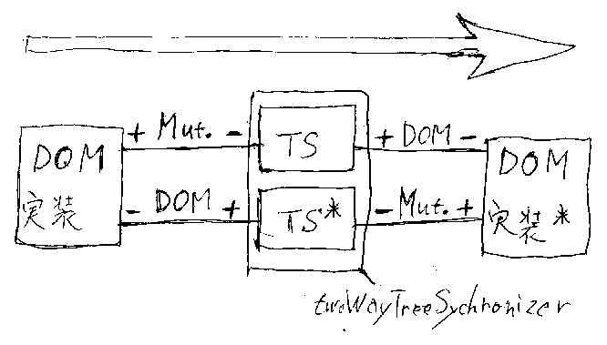 DOM実装のなかで、Mutationポートにだけ注目すると、そのプロファイルは [→+Mutation]だと思ってよい。このMutationを聞いて(listenして)、別な DOMツリーを操作して同期させるようなコンポネントをtreeSynchronizerとす ると、そのプロファイルは[-Mutation → +DOM]となる。ここでインターフェー スDOMとは、DOMのツリー構築/ツリー操作APIだと解釈して欲しい(*注5)。 すると、実際にDOMツリー構築/ツリー操作APIを提供しているコンポネントの プロファイルは[-DOM →]となる。