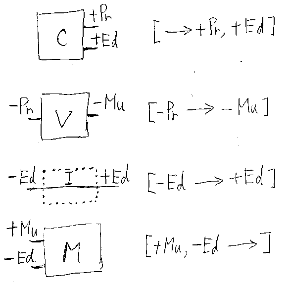 CとMが左右に来たので、Vは真ん中の位置に落ち着く。CとMをつないでいる 「編集API」のワイヤーが、Vの下を素通りしていくが、伸びたワイヤーは自明 なジャンクションだと思いましょう(このジャンクションをIとする)。点線で描いて あるV'という箱は、VとIの並列結合である。つまり、V'=V + I だから、パイ プラインを表現する式は次のとおり。(この段落がよく分からないなら、 記事「ETBダイアグラム」にざっと目を通そう。)