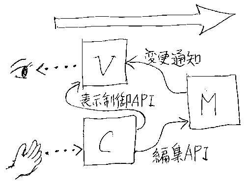 図に描いた矢印と反対方向への情報/制御フローも実際には存在する。Vから Mの編集APIを呼んだりするのは好ましくないのだが、そういうケースもままあ る :-)。