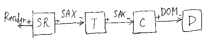 これらがパイプラインを作るのは明らかだよね。次の図のようになる。図で は、 saxReader -- SR, transformer -- T, treeComposer -- C, domProvider -- D と略記している。(readerコンポネントは描き忘れた:-))