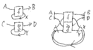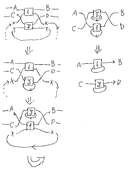 (C, +, 0, σ, Tr)はトレース付きモノイド圏(traced monoidal category)だとする。Cの射 f:A+X→B+X, g:C+Y→D+Yに対して: