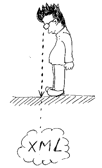 僕は、XML(上の段落で注意した用法)に対して、ずっと期待や希望を持って いるし、一方では、かなりの不満も抱いています。「愛憎相半ばする」と いうか、「引き裂かれた感情」というか、ちょっと複雑な気分ですね。