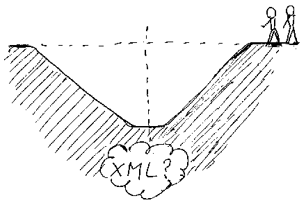 かつて僕が書いたXML関連記事(もちろん、誰が見てもそう思える)を多少手 直ししたり、最近の話題を付け加えて公開すれば、それなりに受ける(読む人 もいる)かな?とも思うのですが、なかなか、そういう気分になれませんね (*注1)。余裕がない理由は、いま僕は、スコップやツルハシを振り上げて、穴 を掘っているような状態だからです。「穴を掘る」は比喩的表現ですが、どう してそんな気分がするかを次節以降で説明します。